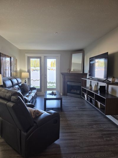 Nestled in the desirable community of Devonshire. This quaint and cozy one-bedroom + den family friendly condo is sure to impress with the inviting open concept living area that maximizes space and functionality. Stepping inside, you will be greeted with the meticulously maintained interior complete with upgraded gorgeous vinyl plank flooring throughout. The kitchen is tastefully designed in a U-shape and boasts gorgeous cabinetry with plenty of granite top counterspace, creating an elegant yet practical cooking environment, whether cooking for one or hosting a dinner with friends. The living area, adorned with large windows, fills the space with an abundance of natural light, highlighting the warmth of the interior. The adjacent balcony presents an ideal spot for relaxing with a morning coffee. Relax and curled up with your favorite book or movie on a cold winter's night in front of your fully functional gas fireplace. The spacious primary bedroom is beautifully decorated and features a king size bed. The den provides versatility, whether it be for family, guests or a home office and features a queen size bed. Finishing off this suite, you will discover a 4-piece bathroom, along with IN-SUITE LAUNDRY, for your convenience.