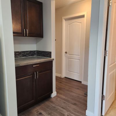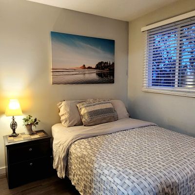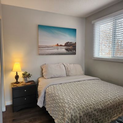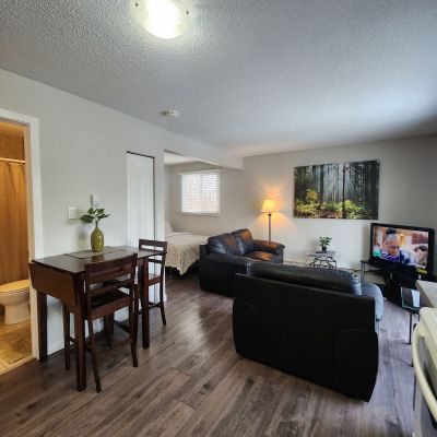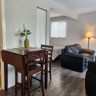 This cute and cozy fully self-contained bachelor suite consists of a combination kitchen, living room, bedroom and storage room, with your own bathroom. Featuring new cabinetry, modern backsplash and luxury vinyl plank flooring, this suite comes with a fully equipped kitchen, bedroom and bathroom linens and all furnishings, complete with Smart TV.