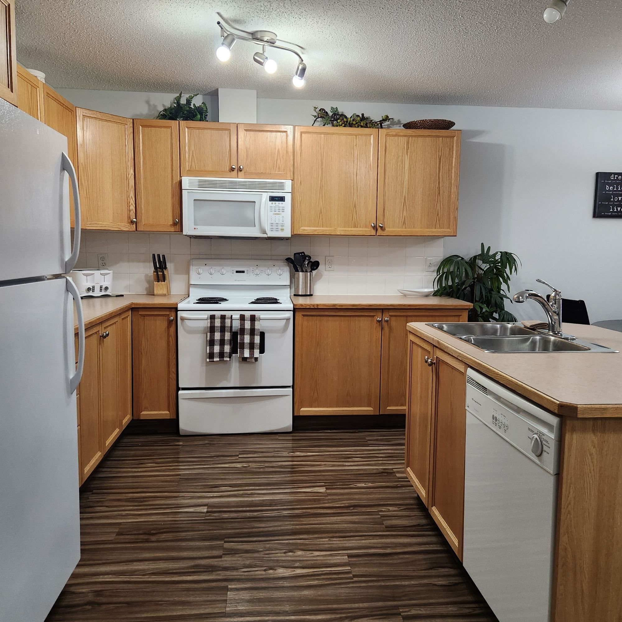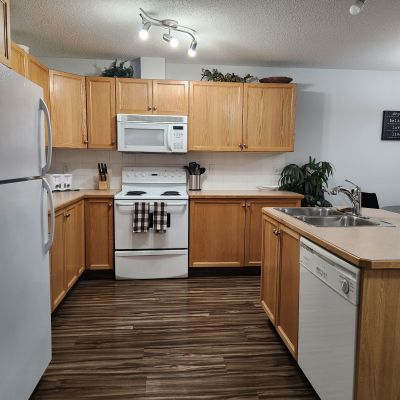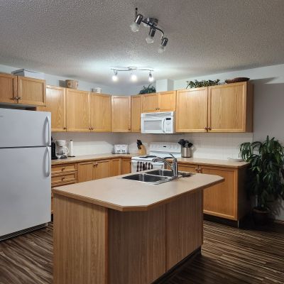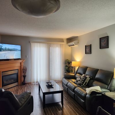 This spacious two bedroom plus a den suite will impress you with features such as an open layout, private balcony complete with gas BBQ hookups and in-suite laundry. Stepping inside, you will notice the meticulously maintained interior with beautiful vinyl plank flooring/ The kitchen features gorgeous oak cabinetry, ample counter space, four appliances and fully equipped for cooking your meals. The spacious living room provides lots of natural light and features a gas fireplace to cozy up with on those chilly nights. The primary bedroom features a queen bed complete with bedding and your own private ensuite. Your second bedroom also features a queen bed, complete with bedding and the den provides versatility, whether it be for family, guests or a home office. Finishing off your suite you'll discover the 4-piece bathroom and the convenience of your own IN-SUITE LAUNDRY.