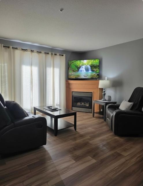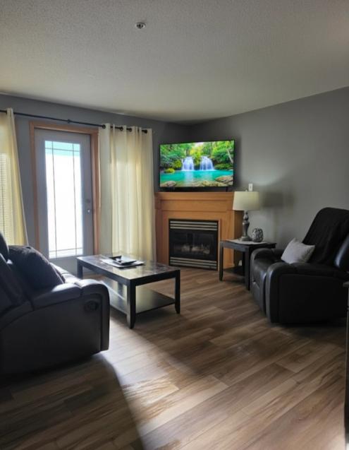 Stepping inside, you will be greeted with the meticulously maintained interior complete with upgraded gorgeous vinyl plank flooring throughout. The kitchen is tastefully designed in a C-shape and boasts modern cabinetry with plenty of counterspace, creating an elegant yet practical cooking environment, whether cooking for one or hosting a dinner with friends. The living area, adorned with large patio windows, fills the space with an abundance of natural light, highlighting the warmth of the interior. The adjacent balcony presents an ideal spot for relaxing with a morning coffee. Relax, curled up with your favorite book or movie on a cold winter's night in front of your fully functional gas fireplace. The spacious primary bedroom is beautifully decorated and features a queen size bed. The den provides versatility, whether it be for family, guests, or a home office. Finishing off this suite, you will discover a 4-piece bathroom, along with IN-SUITE LAUNDRY, for your convenience.